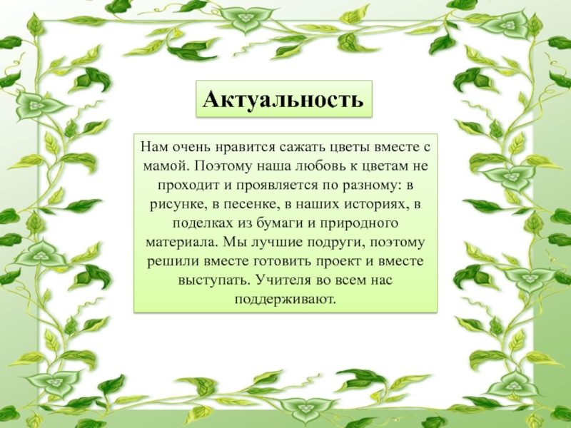 к цветам не проходит и проявляется по разному: в рисунке, в песенке, в наших историях, в поделках из бумаги и природного материала. Мы лучшие подруги, поэтому решили вместе готовить проект и вместе выступать. Учителя во всем нас поддерживают.