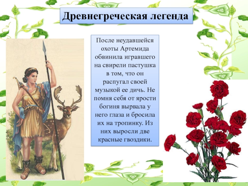 том, что он распугал своей музыкой ее дичь. Не помня себя от ярости богиня вырвала у него глаза и бросила их на тропинку. Из них выросли две красные гвоздики.