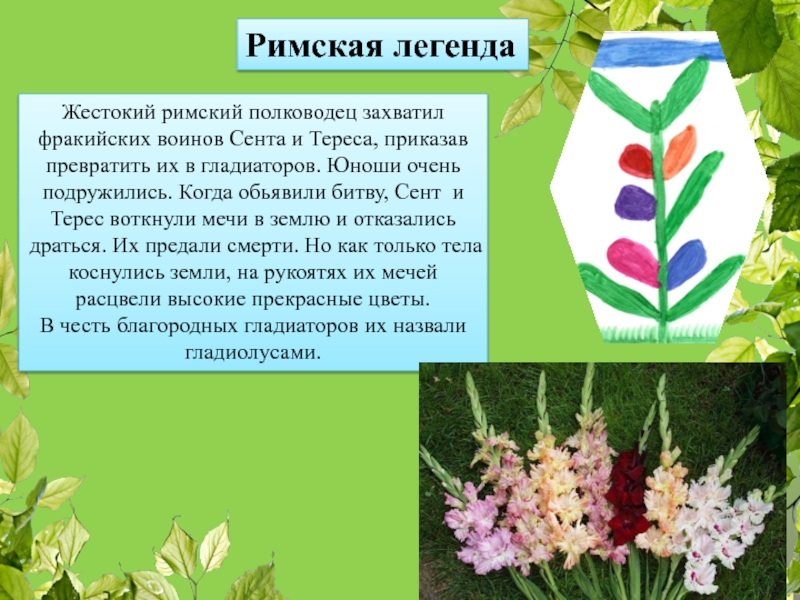 превратить их в гладиаторов. Юноши очень подружились. Когда обьявили битву, Сент и Терес воткнули мечи в землю и отказались драться. Их предали смерти. Но как только тела коснулись земли, на рукоятях их мечей расцвели высокие прекрасные цветы.
