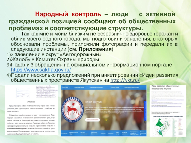 Так как мне и моим близким не безразлично здоровье горожан и облик моего родного города, мы подготовили заявления, в которых обосновали проблемы, приложили фотографии и передали их в следующие инстанции (см. Приложения):