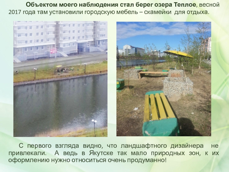 С первого взгляда видно, что ландшафтного дизайнера не привлекали. А ведь в Якутске так мало природных зон, к их оформлению нужно относиться очень продуманно!