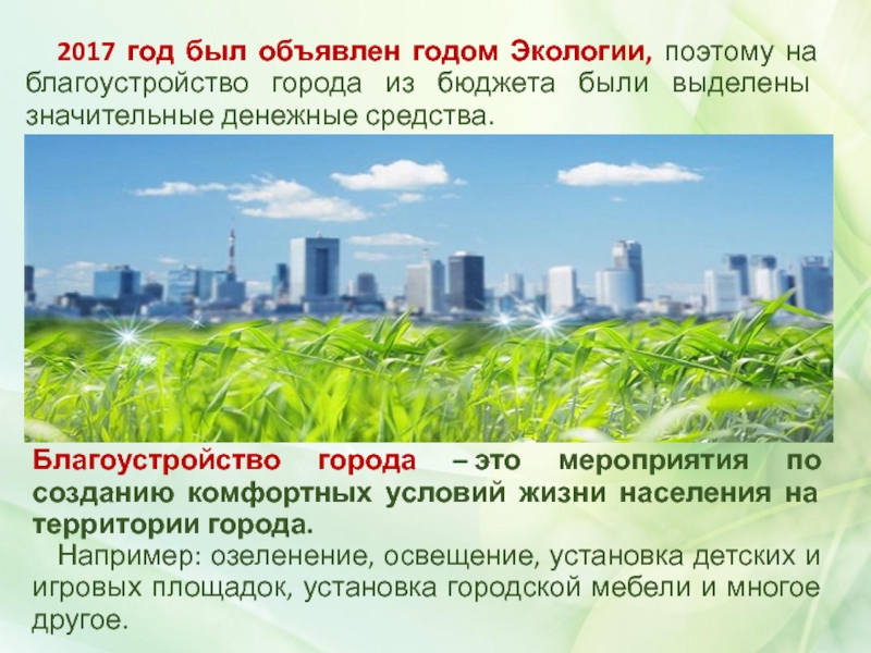 Благоустройство города – это мероприятия по созданию комфортных условий жизни населения на территории города.