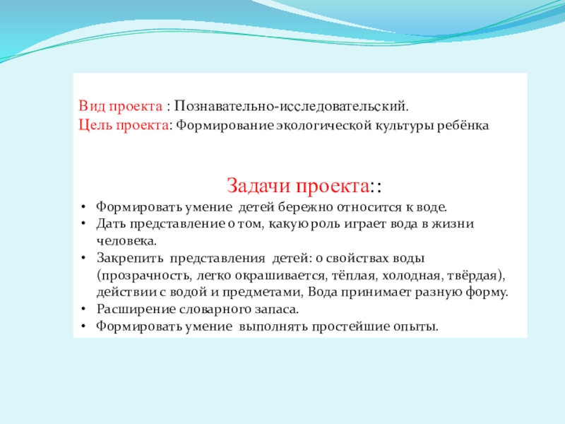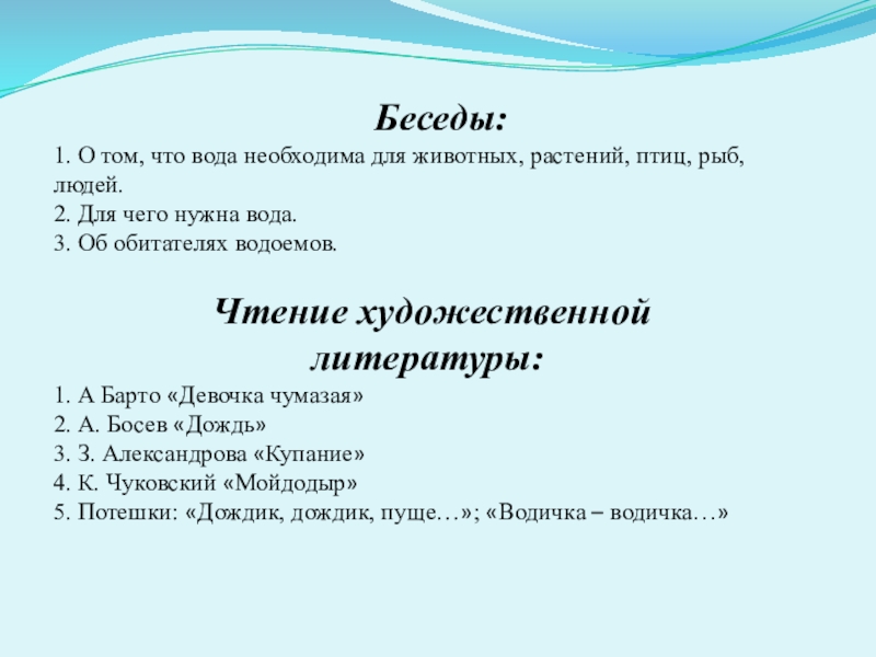 формирование познавательного интереса; воспитание бережного отношения к воде.