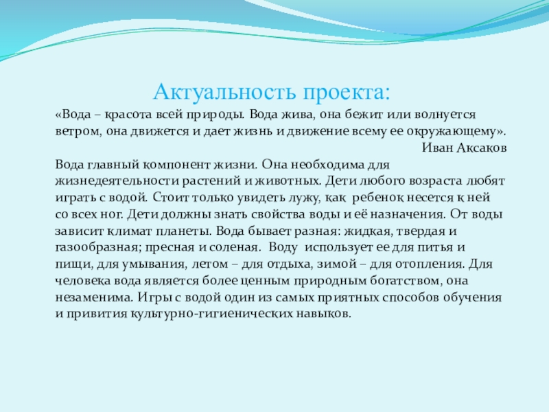 Вода главный компонент жизни. Она необходима для жизнедеятельности растений и животных. Дети любого возраста любят играть с водой. Стоит только увидеть лужу, как ребенок несется к ней со всех ног. Дети должны знать свойства воды и её назначения. От воды зависит климат планеты. Вода бывает разная: жидкая, твердая и газообразная; пресная и соленая. Воду использует ее для питья и пищи, для умывания, летом – для отдыха, зимой – для отопления. Для человека вода является более ценным природным богатством, она незаменима. Игры с водой один из самых приятных способов обучения и привития культурно-гигиенических навыков.