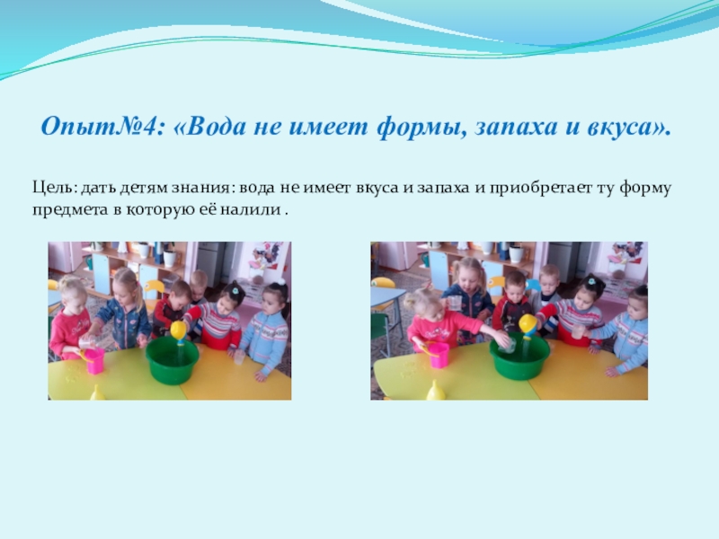 Опыт№4: «Вода не имеет формы, запаха и вкуса».