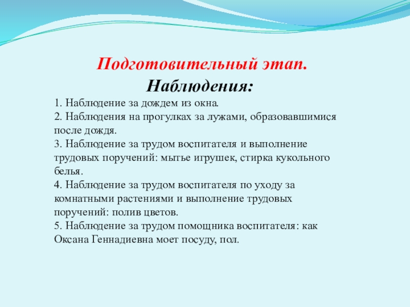 5. Наблюдение за трудом помощника воспитателя: как Оксана Геннадиевна моет посуду, пол.