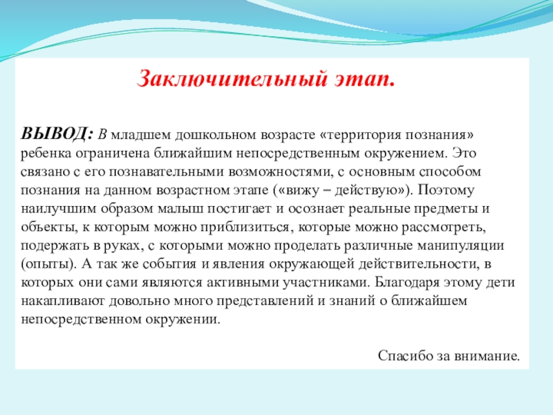 ВЫВОД: В младшем дошкольном возрасте «территория познания» ребенка ограничена ближайшим непосредственным окружением. Это связано с его познавательными возможностями, с основным способом познания на данном возрастном этапе («вижу – действую»). Поэтому наилучшим образом малыш постигает и осознает реальные предметы и объекты, к которым можно приблизиться, которые можно рассмотреть, подержать в руках, с которыми можно проделать различные манипуляции (опыты). А так же события и явления окружающей действительности, в которых они сами являются активными участниками. Благодаря этому дети накапливают довольно много представлений и знаний о ближайшем непосредственном окружении.