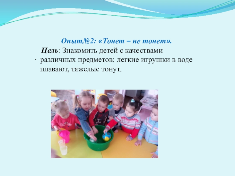 предметов: легкие игрушки в воде плавают, тяжелые тонут.