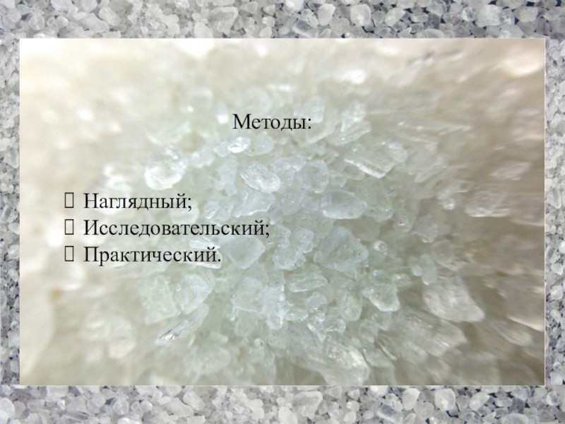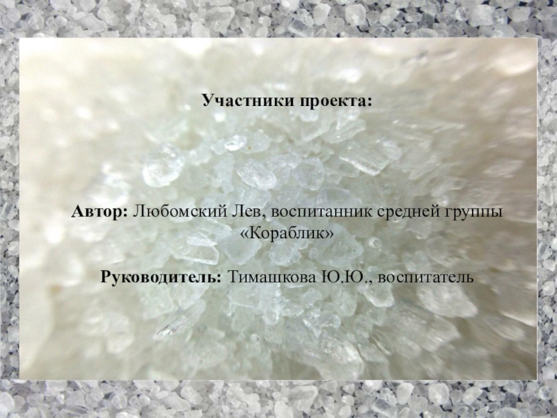 Цель: Формирование представление о соли как необходимом для человека продукте. Изучение свойства поваренной соли.