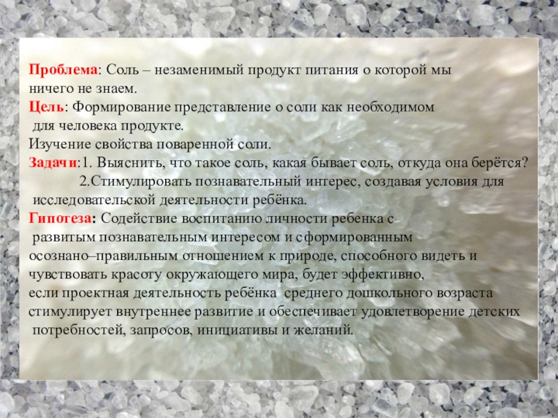Проблема: Соль – незаменимый продукт питания о которой мы