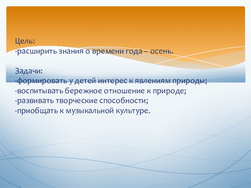 Слайд 3Цель: -расширить знания о времени года – осень. Задачи: -формировать у детей интерес к