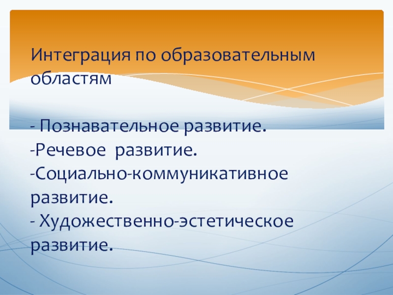 Слайд 4Интеграция по образовательным областям - Познавательное развитие. -Речевое развитие. -Социально-коммуникативное развитие. - Художественно-эстетическое развитие.