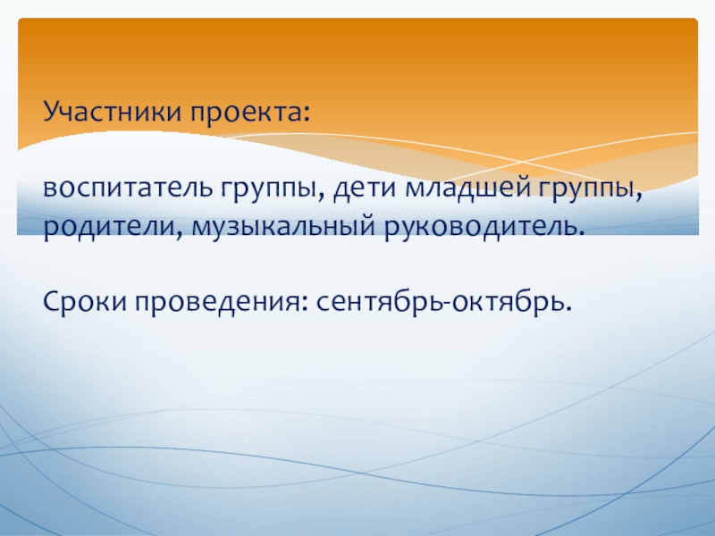Слайд 2Участники проекта: воспитатель группы, дети младшей группы, родители, музыкальный руководитель. Сроки проведения: сентябрь-октябрь.