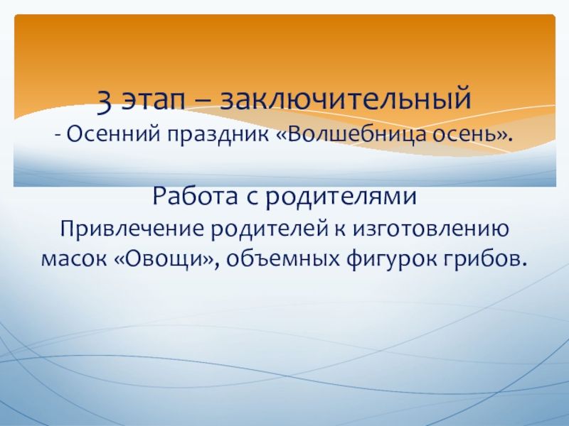 3 этап – заключительный - Осенний праздник «Волшебница осень».  Работа с родителями Привлечение родителей к изготовлению