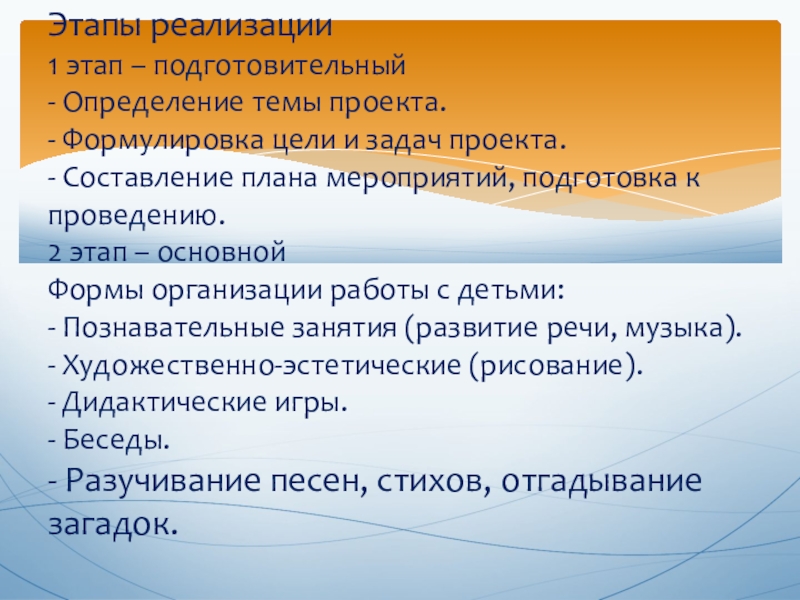задач проекта. - Составление плана мероприятий, подготовка к проведению. 2 этап – основной Формы организации работы с детьми: - Познавательные занятия (развитие речи, музыка). - Художественно-эстетические (рисование). - Дидактические игры. - Беседы. - Разучивание песен, стихов, отгадывание загадок.
