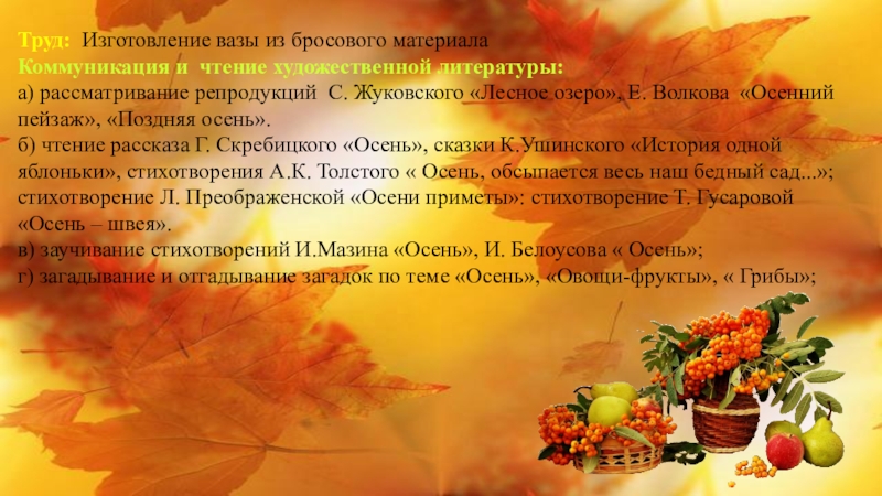 б) чтение рассказа Г. Скребицкого «Осень», сказки К.Ушинского «История одной яблоньки», стихотворения А.К. Толстого « Осень, обсыпается весь наш бедный сад...»; стихотворение Л. Преображенской «Осени приметы»: стихотворение Т. Гусаровой «Осень – швея».