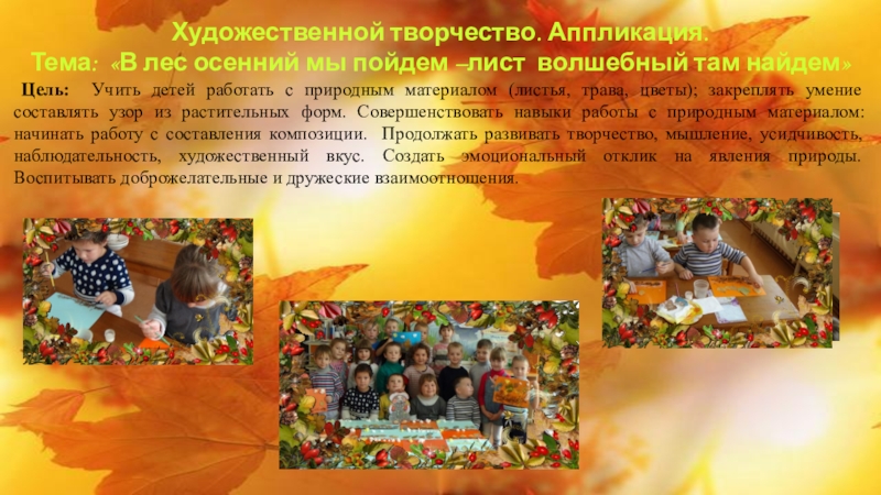 Цель: Учить детей работать с природным материалом (листья, трава, цветы); закреплять умение составлять узор из растительных форм. Совершенствовать навыки работы с природным материалом: начинать работу с составления композиции. Продолжать развивать творчество, мышление, усидчивость, наблюдательность, художественный вкус. Создать эмоциональный отклик на явления природы. Воспитывать доброжелательные и дружеские взаимоотношения.