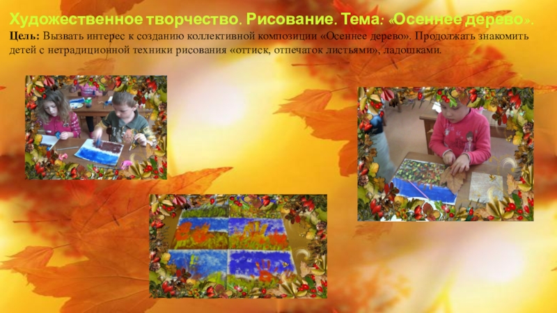 коллективной композиции «Осеннее дерево». Продолжать знакомить детей с нетрадиционной техники рисования «оттиск, отпечаток листьями», ладошками.