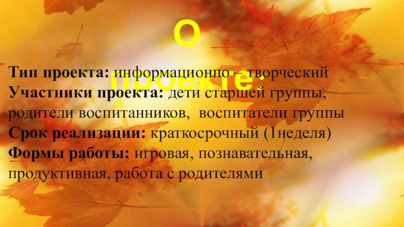 - подготовить для родителей папку – ширму « Здравствуй, Осень Золотая!»