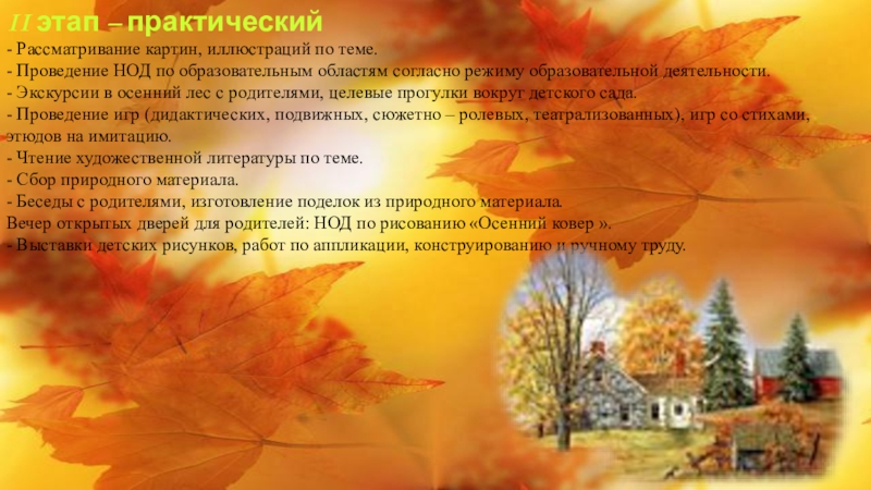 - Экскурсии в осенний лес с родителями, целевые прогулки вокруг детского сада.