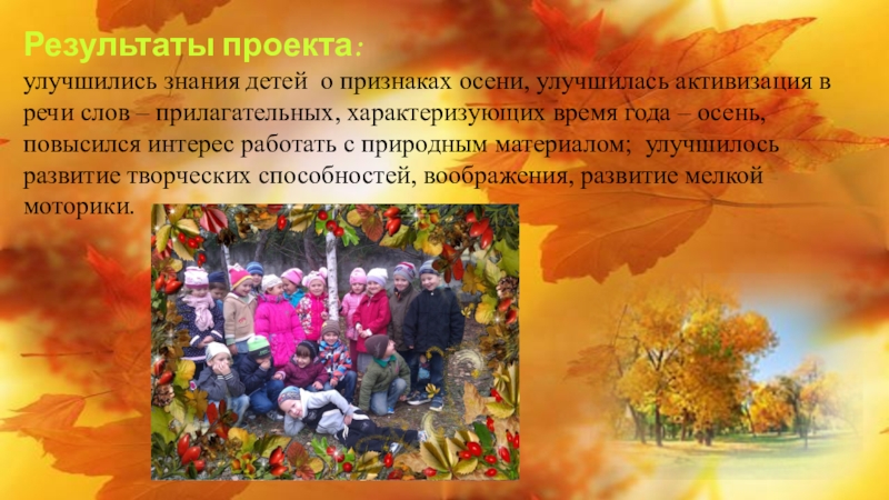 речи слов – прилагательных, характеризующих время года – осень, повысился интерес работать с природным материалом; улучшилось развитие творческих способностей, воображения, развитие мелкой моторики.