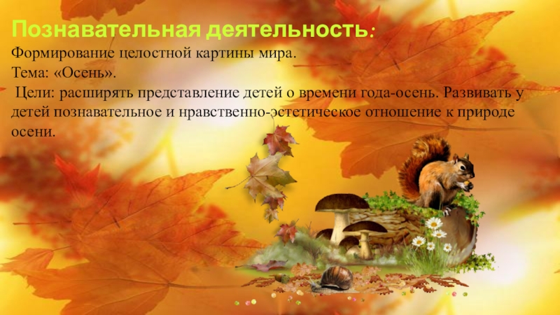 осени и осенних явлениях, содействовать развитию умственных способностей посредством обогащения разносторонними представлениями о жизни природы осенью.