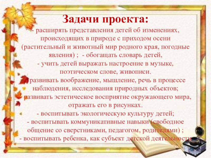 Задачи проекта: - расширять представления детей об изменениях, происходящих в природе с приходом осени (растительный и животный