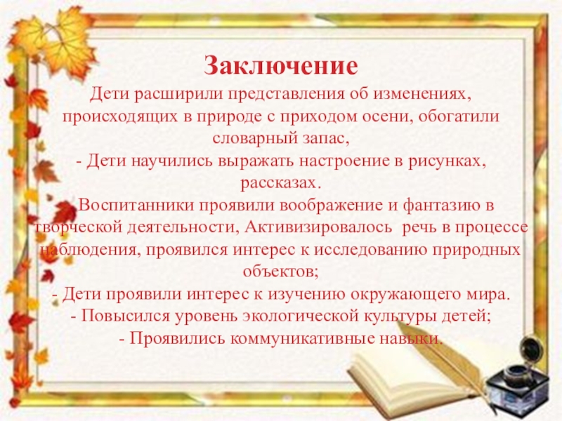 Слайд 17Заключение Дети расширили представления об изменениях, происходящих в природе с приходом осени,