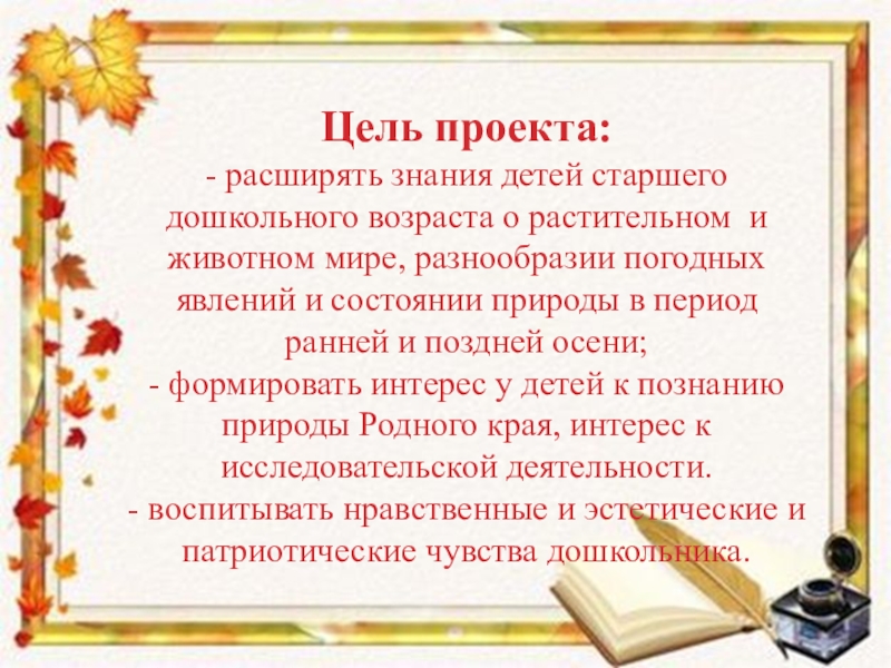 животном мире, разнообразии погодных явлений и состоянии природы в период ранней и поздней осени; - формировать интерес у детей к познанию природы Родного края, интерес к исследовательской деятельности. - воспитывать нравственные и эстетические и патриотические чувства дошкольника.