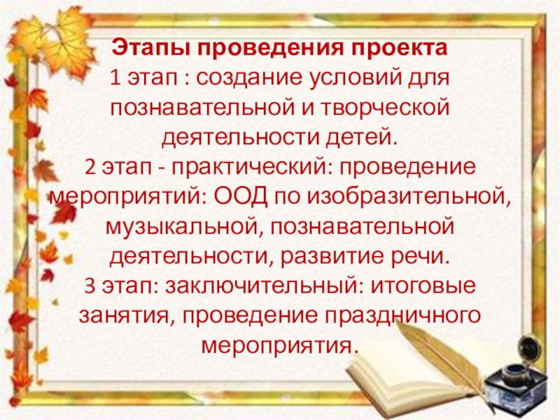 1 этап : создание условий для познавательной и творческой деятельности детей. 2 этап - практический: проведение мероприятий: ООД по изобразительной, музыкальной, познавательной деятельности, развитие речи. 3 этап: заключительный: итоговые занятия, проведение праздничного мероприятия.