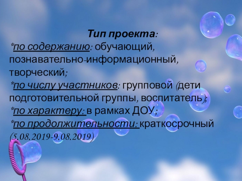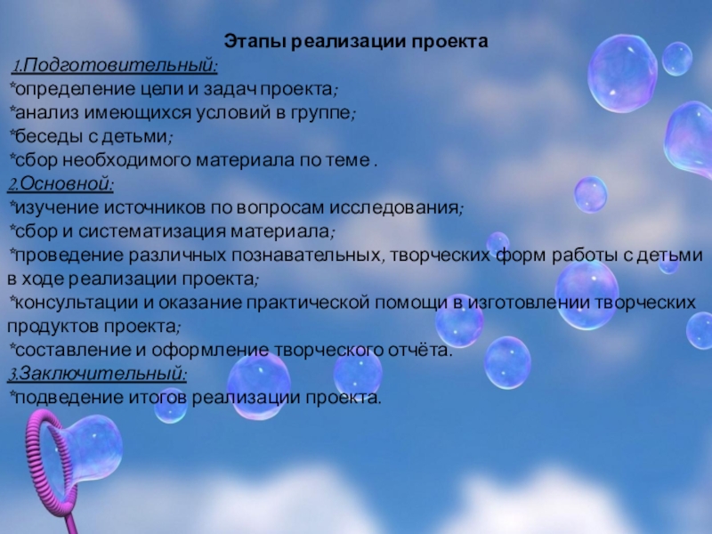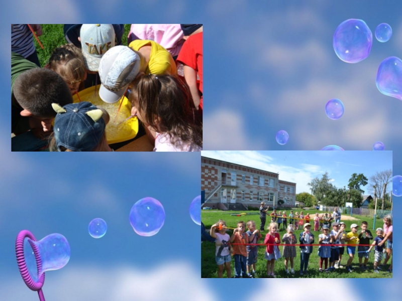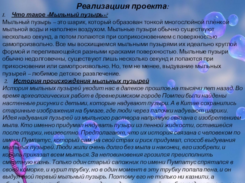 тонкой многослойной плёнкой мыльной воды и наполнен воздухом. Мыльные пузыри обычно существуют несколько секунд, а потом лопаются при соприкосновением с поверхностью самопроизвольно. Все мы восхищаемся мыльными пузырями:их идеально круглой формой и переливающейся разными красками поверхностью. Мыльные пузыри обычно недолговечны, существуют лишь несколько секунд и лопаются при прикосновении или самопроизвольно. Но, тем не менее, выдувание мыльных пузырей – любимое детское развлечение.