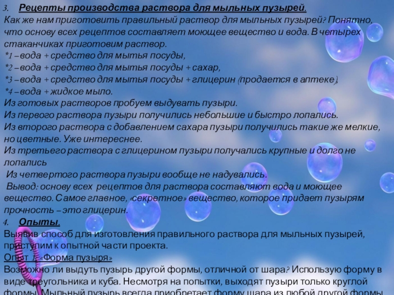 Слайд 8Рецепты производства раствора для мыльных пузырей.