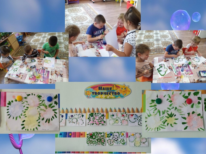 Взяли стаканчики с цветным раствором и трубочку, начали дуть через неё в мыльную воду, у нас образовалось много пузырей. Взяли белый лист бумаги и прислонили её сверху к пузырям или трубочкой можно «собрать» пузыри и «перенесите» их на лист бумаги. В результате получились случайные разноцветные узоры. После высыхания дети увидели в узорах солнышко, бабочек, цветы, небо и др. Каждый из них дорисовал свой рисунок .