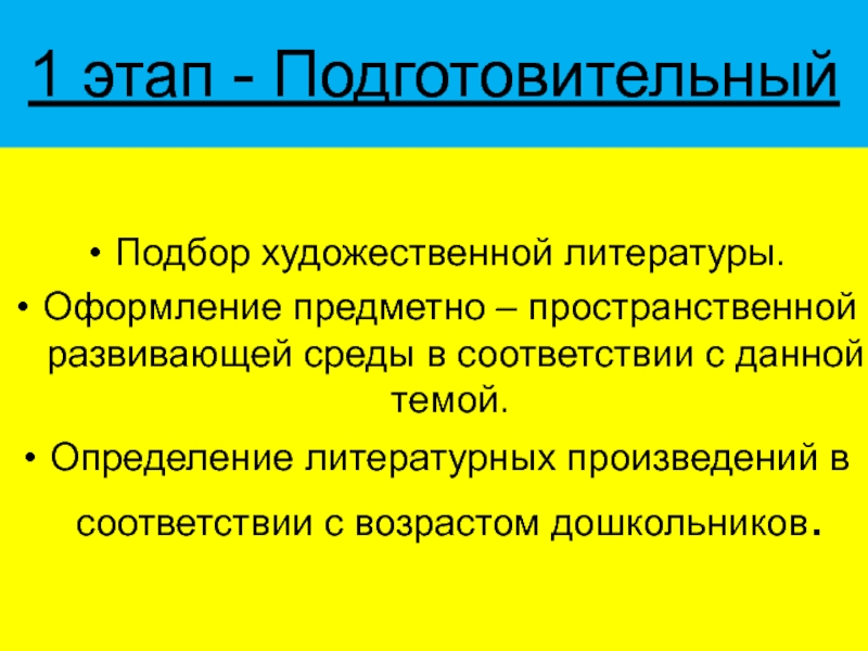 1 этап - Подготовительный Подбор художественной литературы. Оформление предметно – пространственной развивающей среды в соответствии с