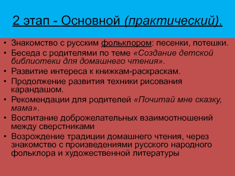 2 этап - Основной (практический). Знакомство с русским фольклором: песенки, потешки.Беседа с родителями по теме «Создание