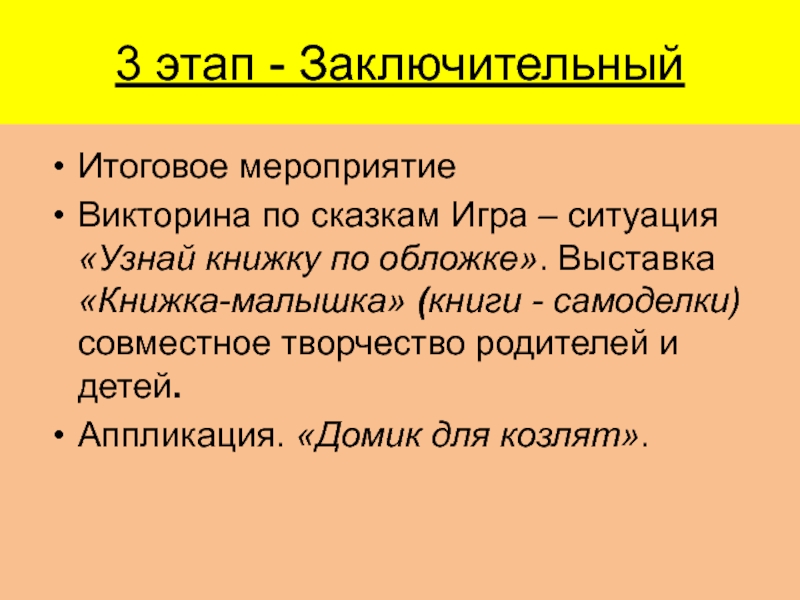 3 этап - ЗаключительныйИтоговое мероприятиеВикторина по сказкам Игра – ситуация «Узнай книжку по обложке». Выставка «Книжка-малышка» (книги