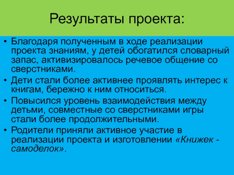 Результаты проекта:Благодаря полученным в ходе реализации проекта знаниям, у детей обогатился словарный запас, активизировалось речевое общение со