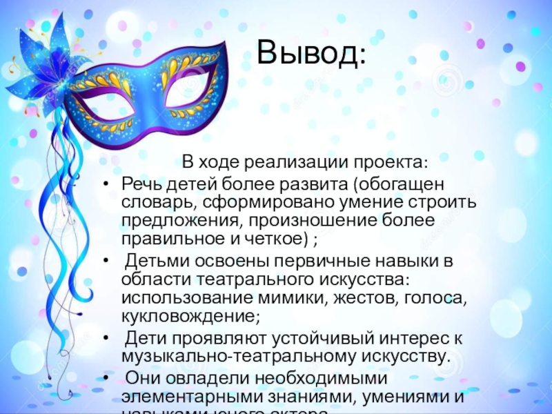 Детьми освоены первичные навыки в области театрального искусства: использование мимики, жестов, голоса, кукловождение;