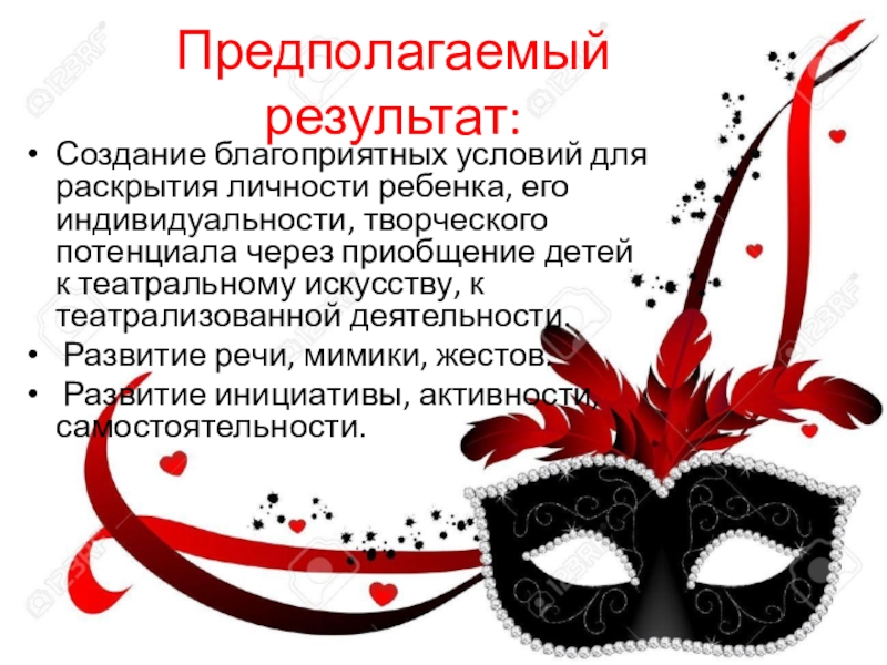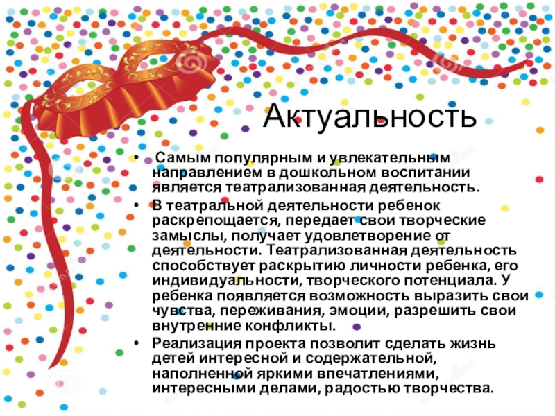 В театральной деятельности ребенок раскрепощается, передает свои творческие замыслы, получает удовлетворение от деятельности. Театрализованная деятельность способствует раскрытию личности ребенка, его индивидуальности, творческого потенциала. У ребенка появляется возможность выразить свои чувства, переживания, эмоции, разрешить свои внутренние конфликты.