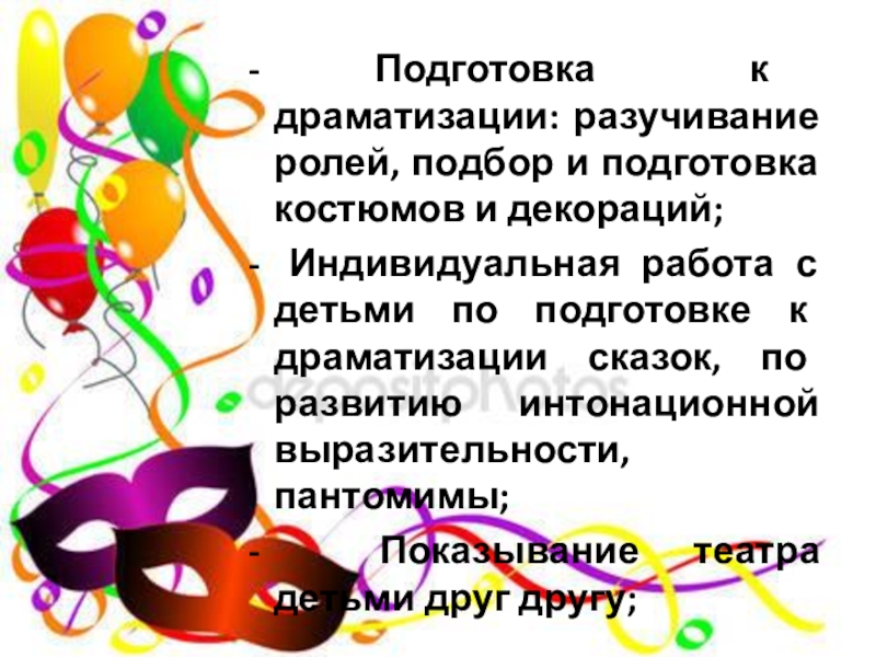 Индивидуальная работа с детьми по подготовке к драматизации сказок, по развитию интонационной выразительности, пантомимы;
