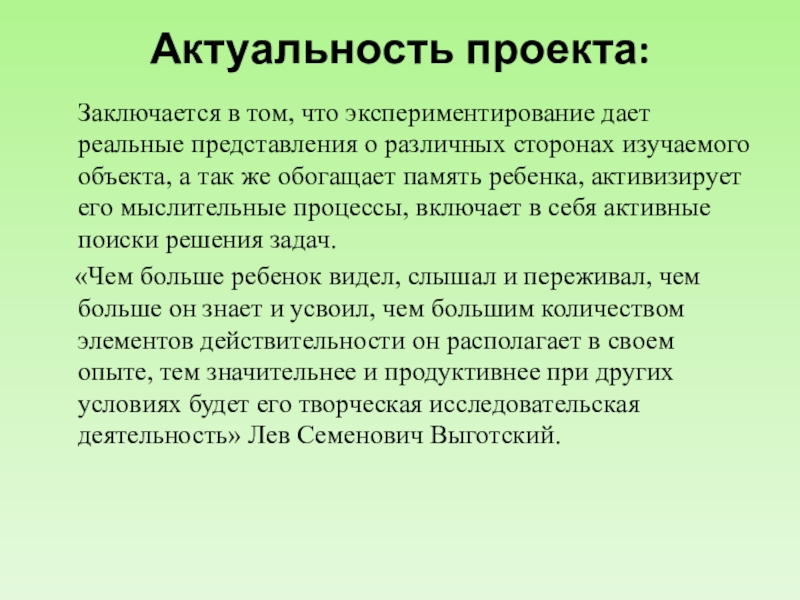 Актуальность проекта: Заключается в том, что экспериментирование дает реальные представления о различных сторонах изучаемого объекта, а так же обогащает память ребенка, активизирует его мыслительные процессы, включает в себя активные поиски решения задач.