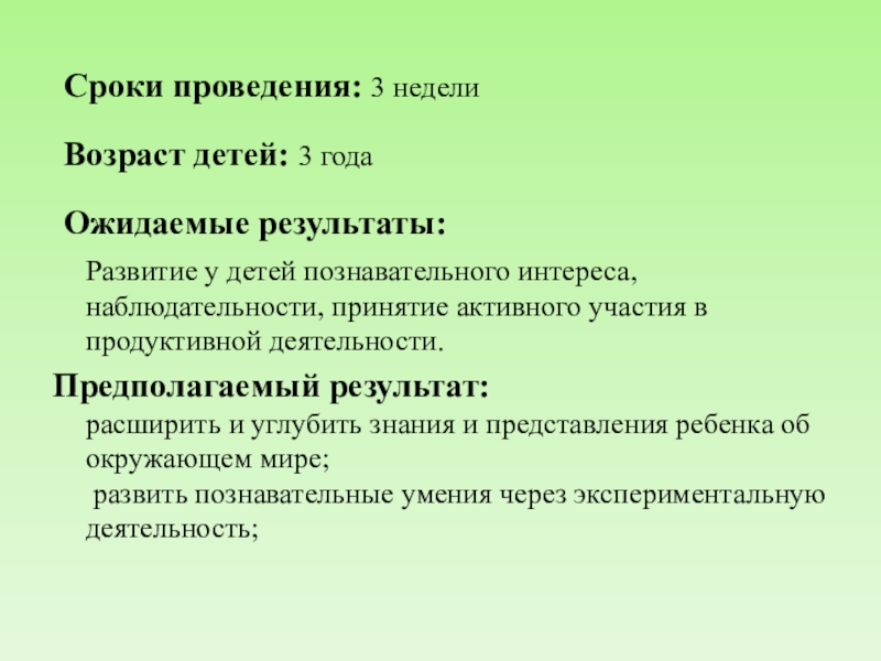 Сроки проведения: 3 недели Возраст детей: 3 года Ожидаемые результаты:   Развитие у детей