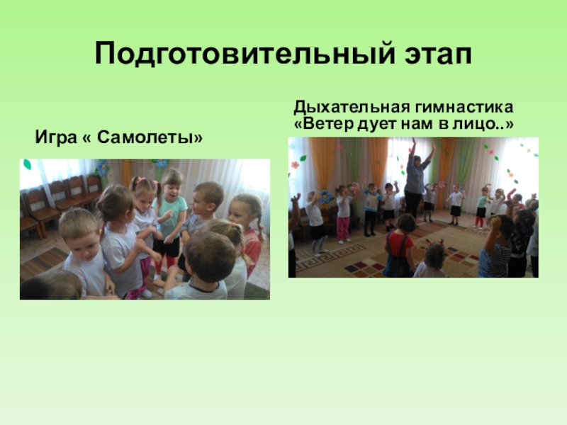 Подготовительный этапИгра « Самолеты»Дыхательная гимнастика «Ветер дует нам в лицо..»