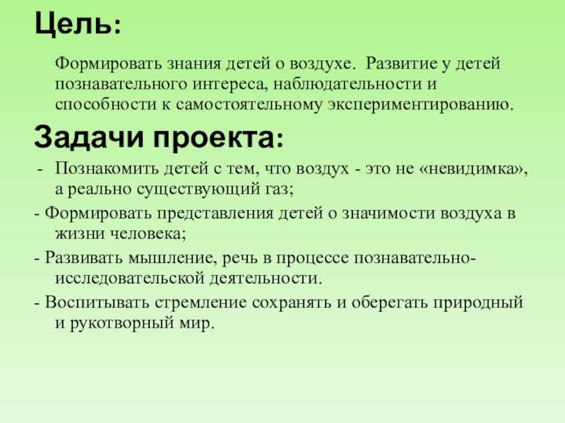 - Формировать представления детей о значимости воздуха в жизни человека;