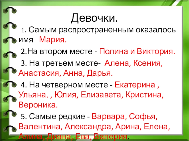 5. Самые редкие - Варвара, Софья, Валентина, Александра, Арина, Елена, Алина, Диана, Ева, Валерия.