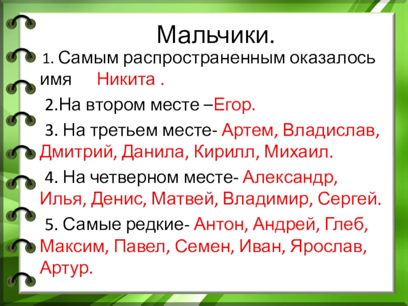 5. Самые редкие- Антон, Андрей, Глеб, Максим, Павел, Семен, Иван, Ярослав, Артур.