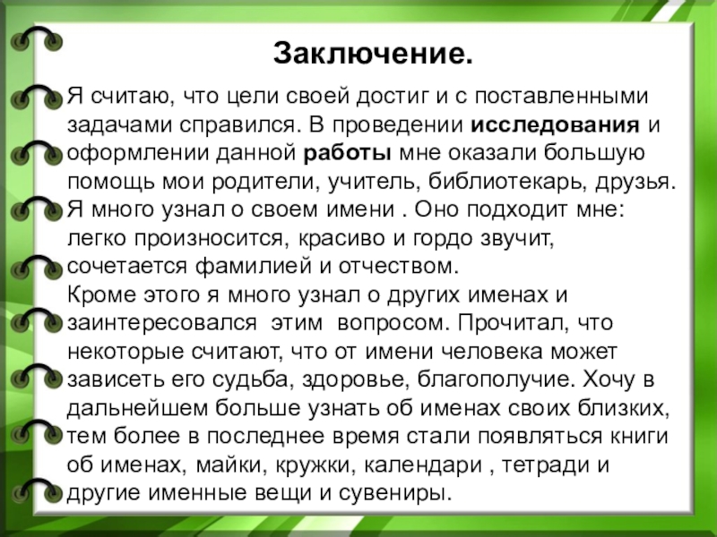 Кроме этого я много узнал о других именах и заинтересовался этим вопросом. Прочитал, что некоторые считают, что от имени человека может зависеть его судьба, здоровье, благополучие. Хочу в дальнейшем больше узнать об именах своих близких, тем более в последнее время стали появляться книги об именах, майки, кружки, календари , тетради и другие именные вещи и сувениры.