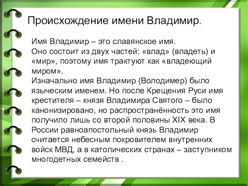 Изначально имя Владимир (Володимер) было языческим именем. Но после Крещения Руси имя крестителя – князя Владимира Святого – было канонизировано, но распространённость это имя получило лишь со второй половины XIX века. В России равноапостольный князь Владимир считается небесным покровителем внутренних войск МВД, а в католических странах – заступником многодетных семейств .