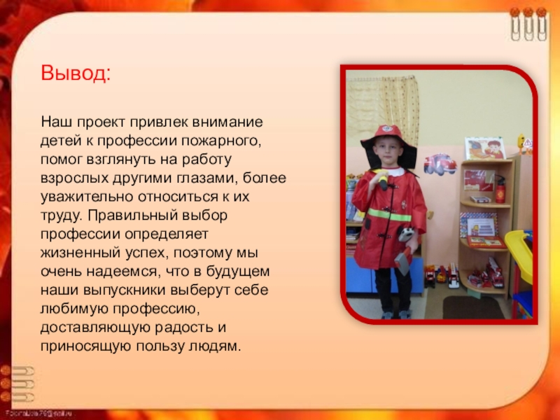 Наш проект привлек внимание детей к профессии пожарного, помог взглянуть на работу взрослых другими глазами, более уважительно относиться к их труду. Правильный выбор профессии определяет жизненный успех, поэтому мы очень надеемся, что в будущем наши выпускники выберут себе любимую профессию, доставляющую радость и приносящую пользу людям.