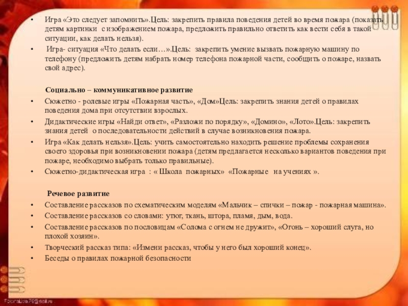 Слайд 9Игра «Это следует запомнить».Цель: закрепить правила поведения детей во время пожара